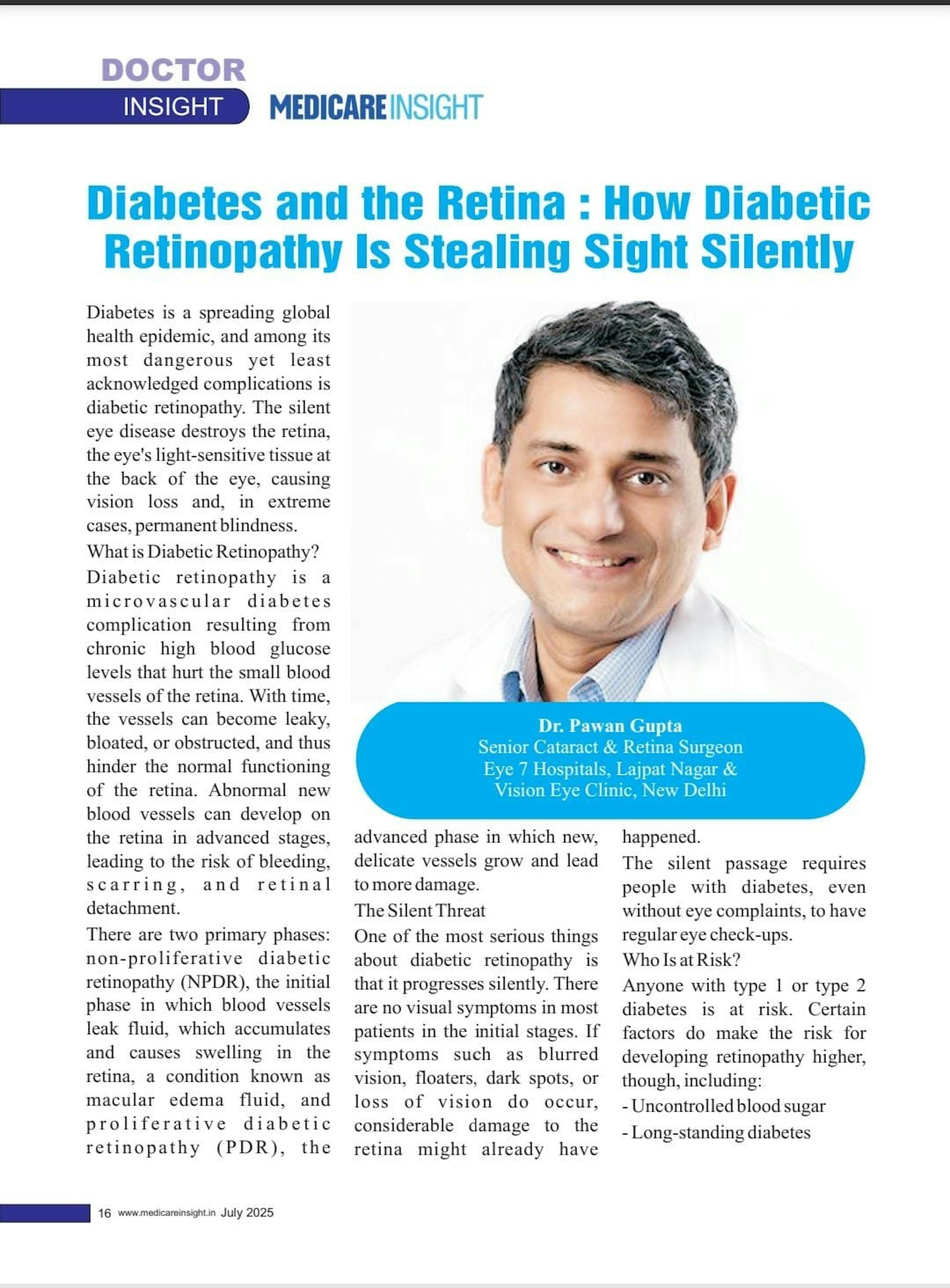 Dr. Pawan Gupta is a distinguished vitreo-retina, uveitis and cataract specialist with extensive training from PGIMER, Chandigarh, one of India's premier institutes. He has mastered both conventional and advanced surgical techniques, such as suture-less vitrectomy, to treat various retinal conditions. He specializes in the treatment of floaters, along with other retinal and uveitic disorders. He is working as senior consultant at Vision Eye Clinic, Laxmi Nagar and Eye 7, Lajpat Nagar Delhi. Dr. Gupta has also served as the Head of the Department of Vitreo-Retina and Uveitis at Venu Eye Institute and Research Centre and is recognized as one of the pioneers of anti-VEGF therapy in India.